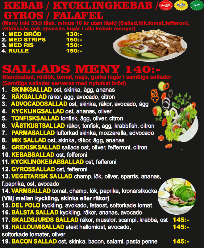 isbergssallad, rödlök, gurka, tomater, falafel, vitlökssås