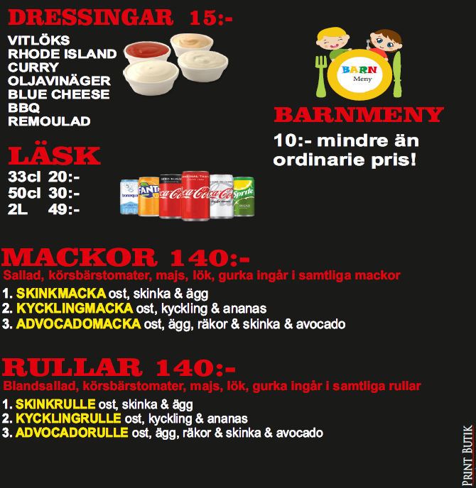 skinka, räkor, ruccola, vitlökssås, avocado